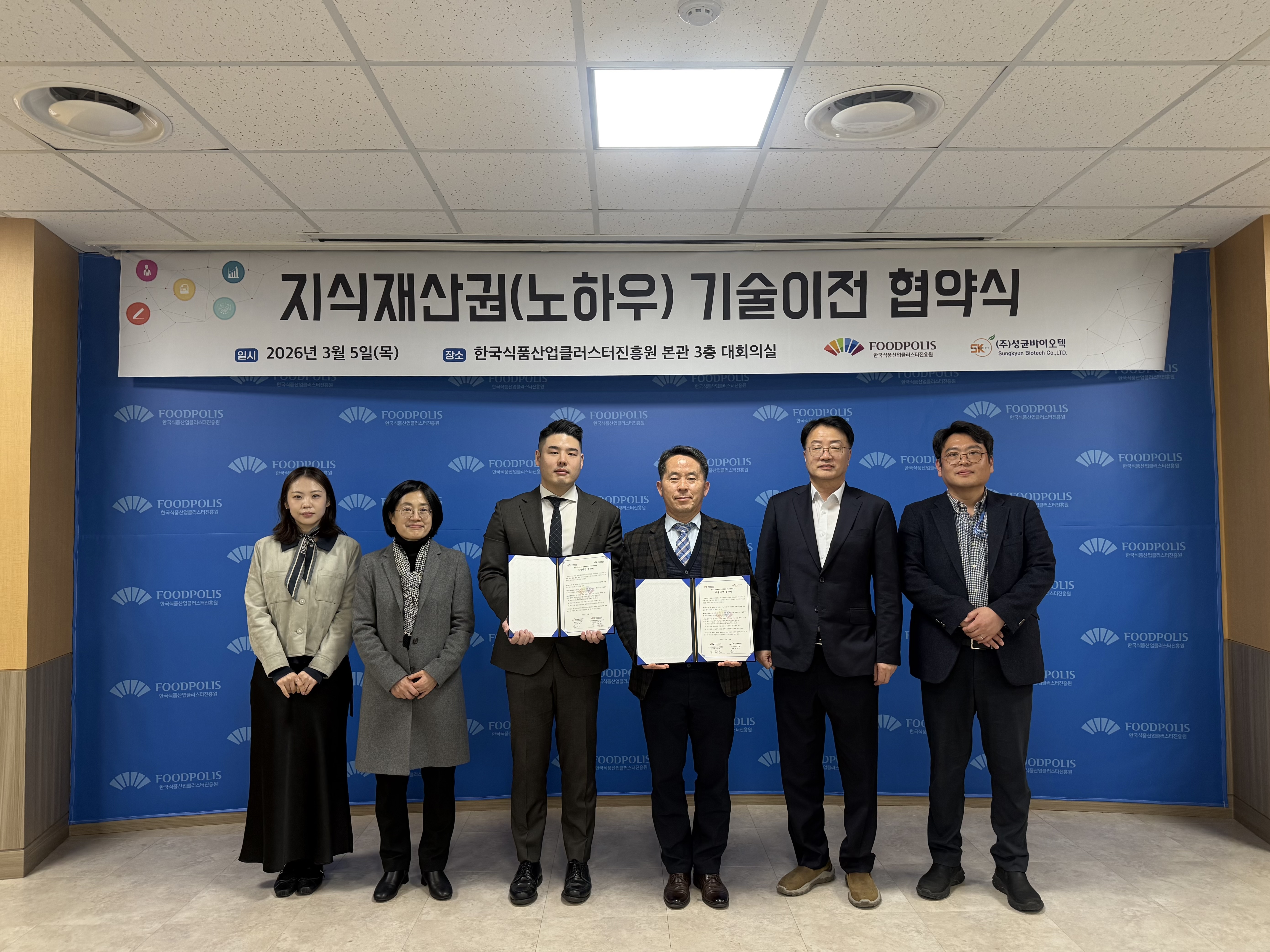 한국식품산업클러스터진흥원(이사장 김덕호, 이하 식품진흥원)은 지난 5일, 성균바이오텍(대표 김진경)과 ’기업지원시설·장비 활용 지원사업‘을 통해 확보된 신규 소재(SB-109)의 연구성과 기술이전 및 사업화 지원을 위한 업무협약(MOU)을 체결했다고 6일 밝혔다.
